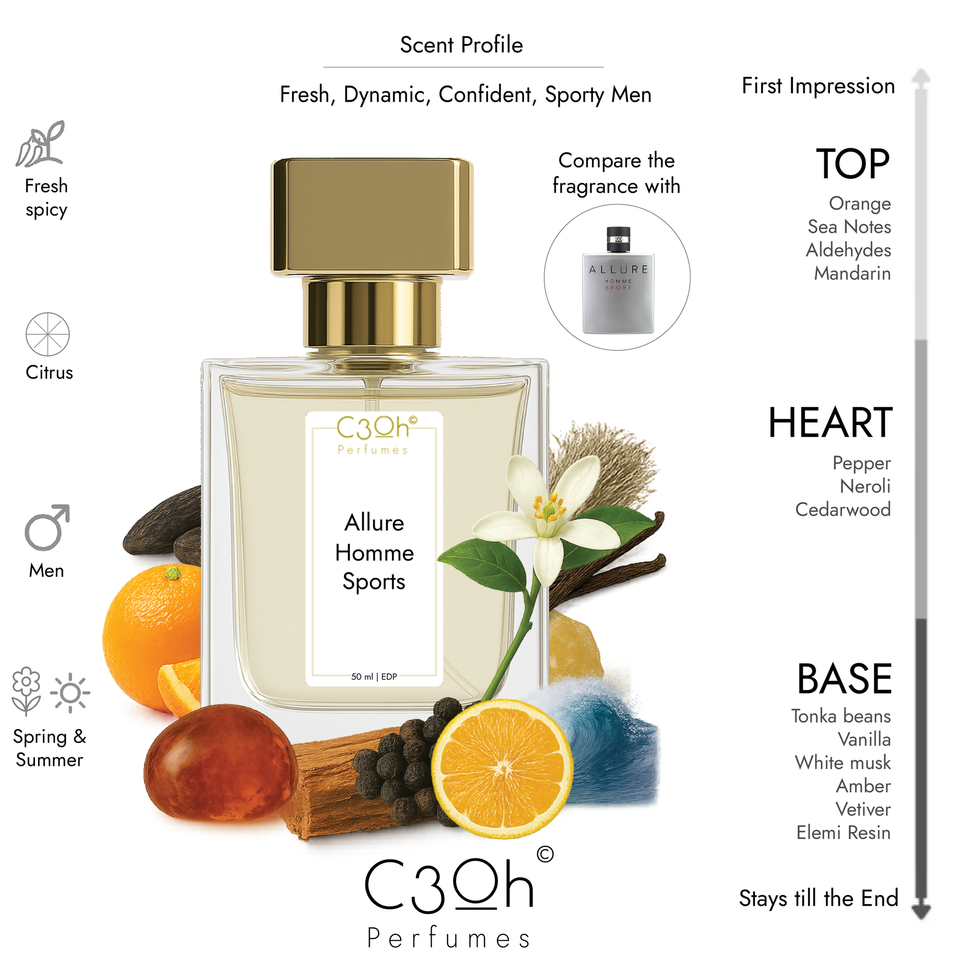 C3oh Allure Homme Perfume Spray for Men | Woody Spicy Oriental Fragrance | 50 ml & 100 ml Men's Eau De Perfume Spray | Luxury Gift for Him | Perfume for Elegant Refined Confident Sophisticated Men